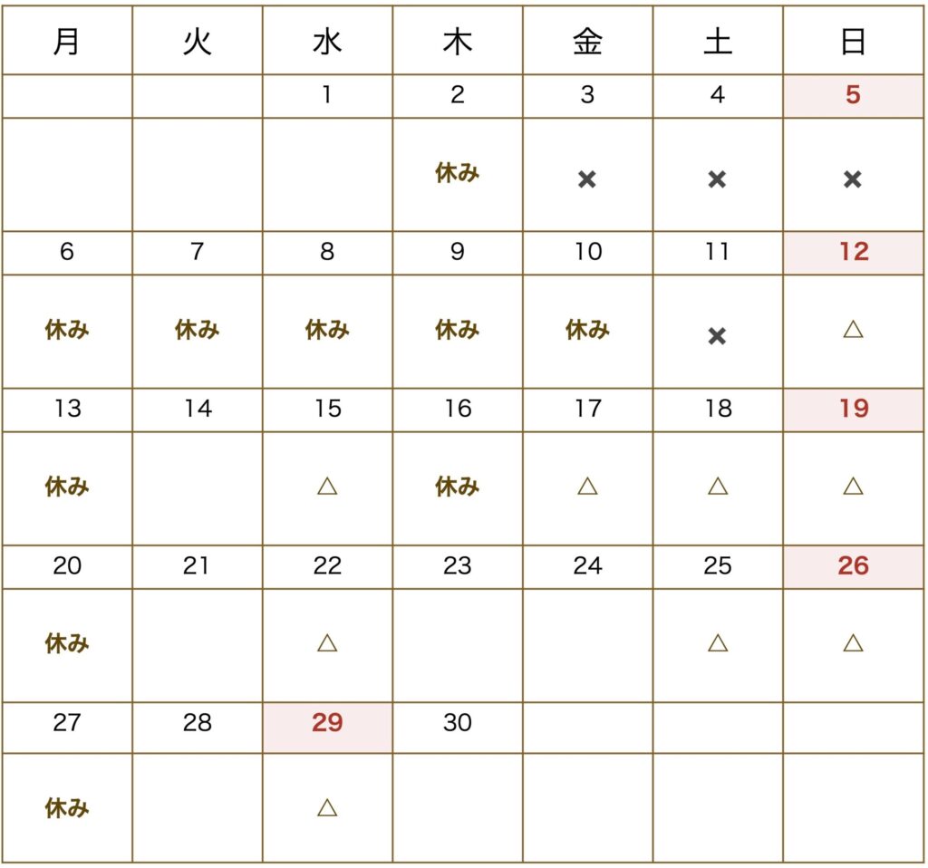 休み 2日,6日~10日,13日,16日,20日,27日